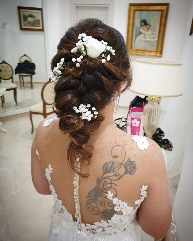 Tornando all’acconciatura, sarà meticolosamente e dettagliatamente scelta assieme con la Sposa in abbinamento alla Storia scelta per quel giorno… già…la sua storia… stile del vestito, della sala, bouquet, dettagli, chiesa, numero degli invitati, sposo, damigelle… tuttoooo! Tutto deve avere un unico filo conduttore, e noi dobbiamo cercare di legare tramite la sposa il tutto…si…perché Lei è al centro di tutto (uomini, non me ne vogliate 😊).