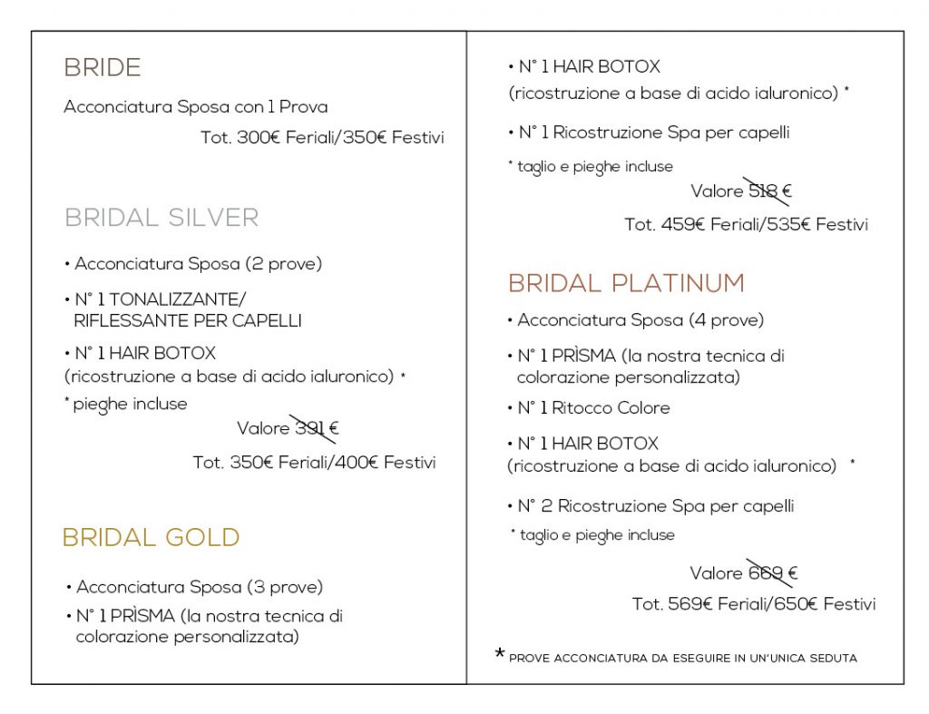 *in tutti i pacchetti (donna) sono incluse le pieghe, che serviranno nei vari appuntamenti e l’eventuale taglio.